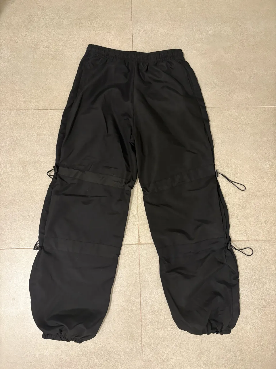 Parachute negro con cordones ajustables en los laterales y en los tobillos.