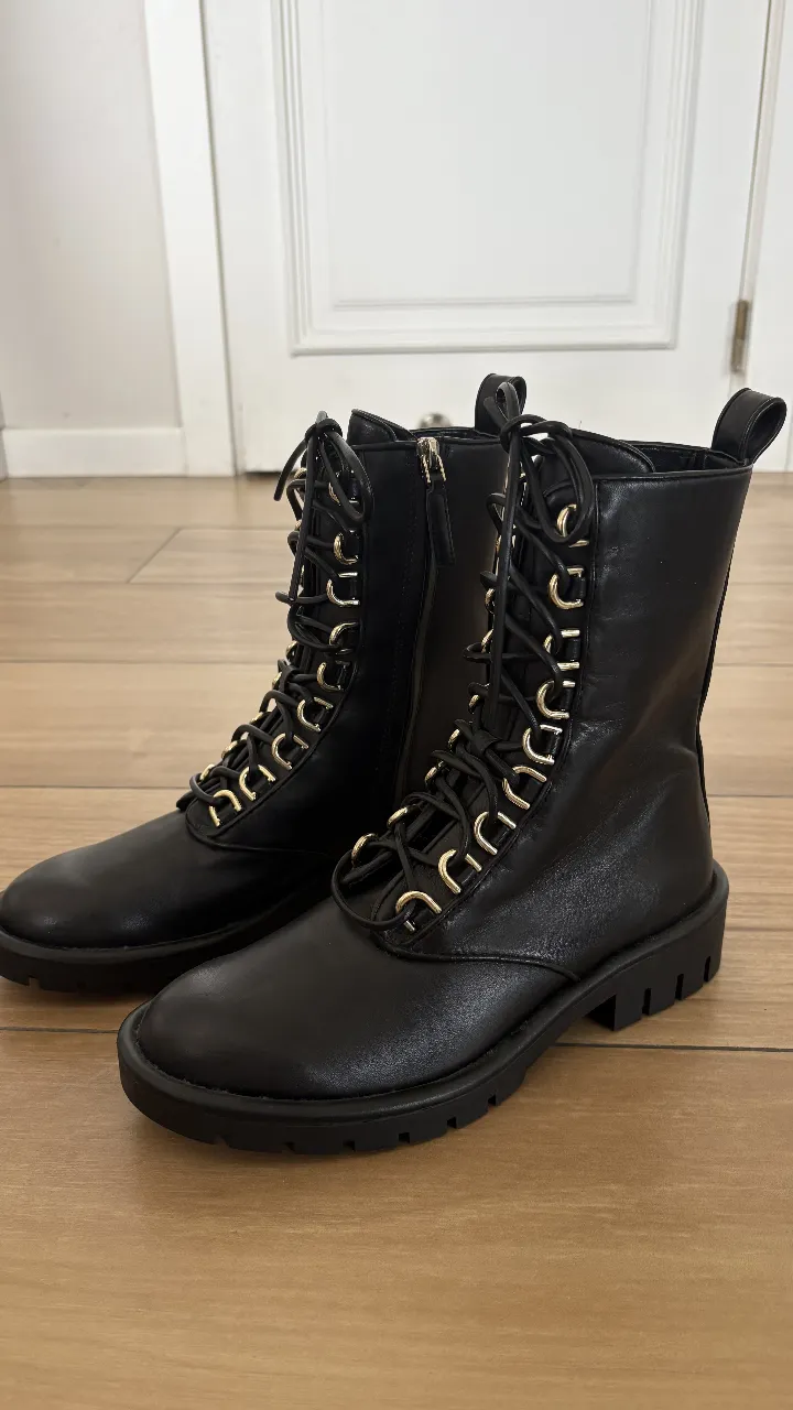 Botas de ecocuero negras con cordones y detalles dorados. Ideales para un look canchero y moderno. COMPLETAMENTE NUEVAS (sin uso)
