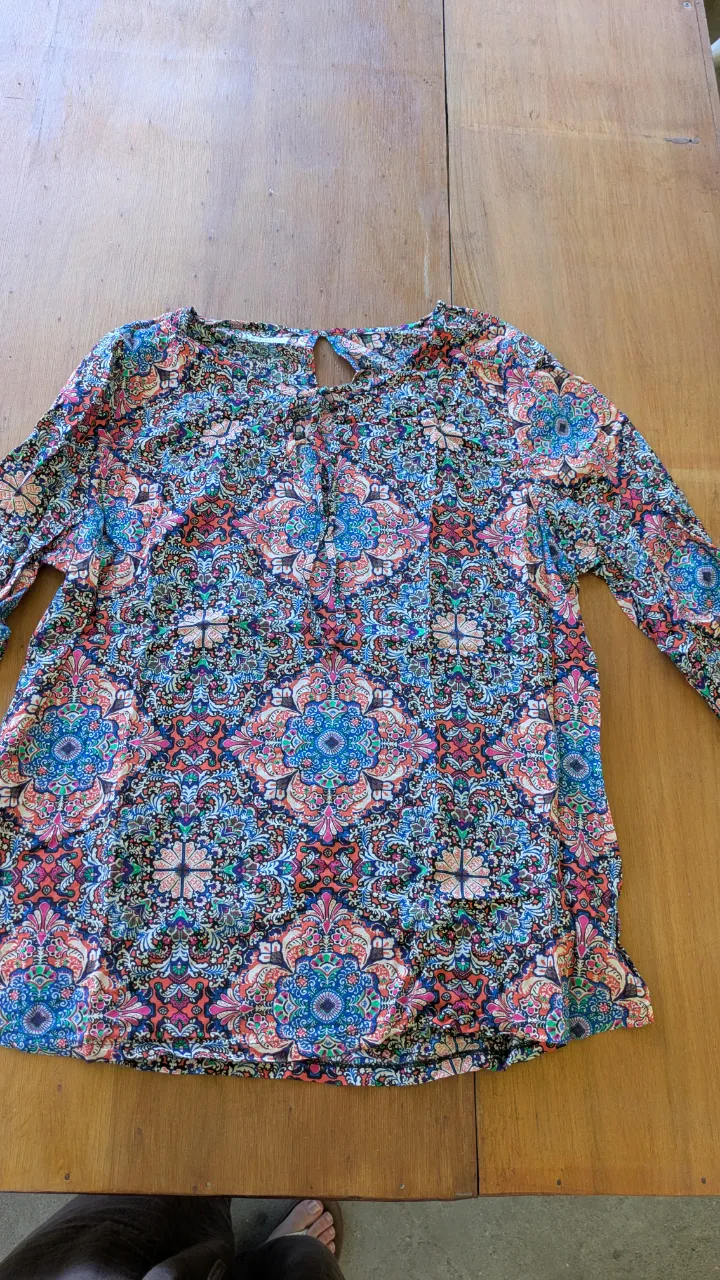 Remera manga larga con estampa vibrante y geométrica. Posee un detalle de recorte en la espalda a la altura del cuello. Ideal para un look casual y con onda.