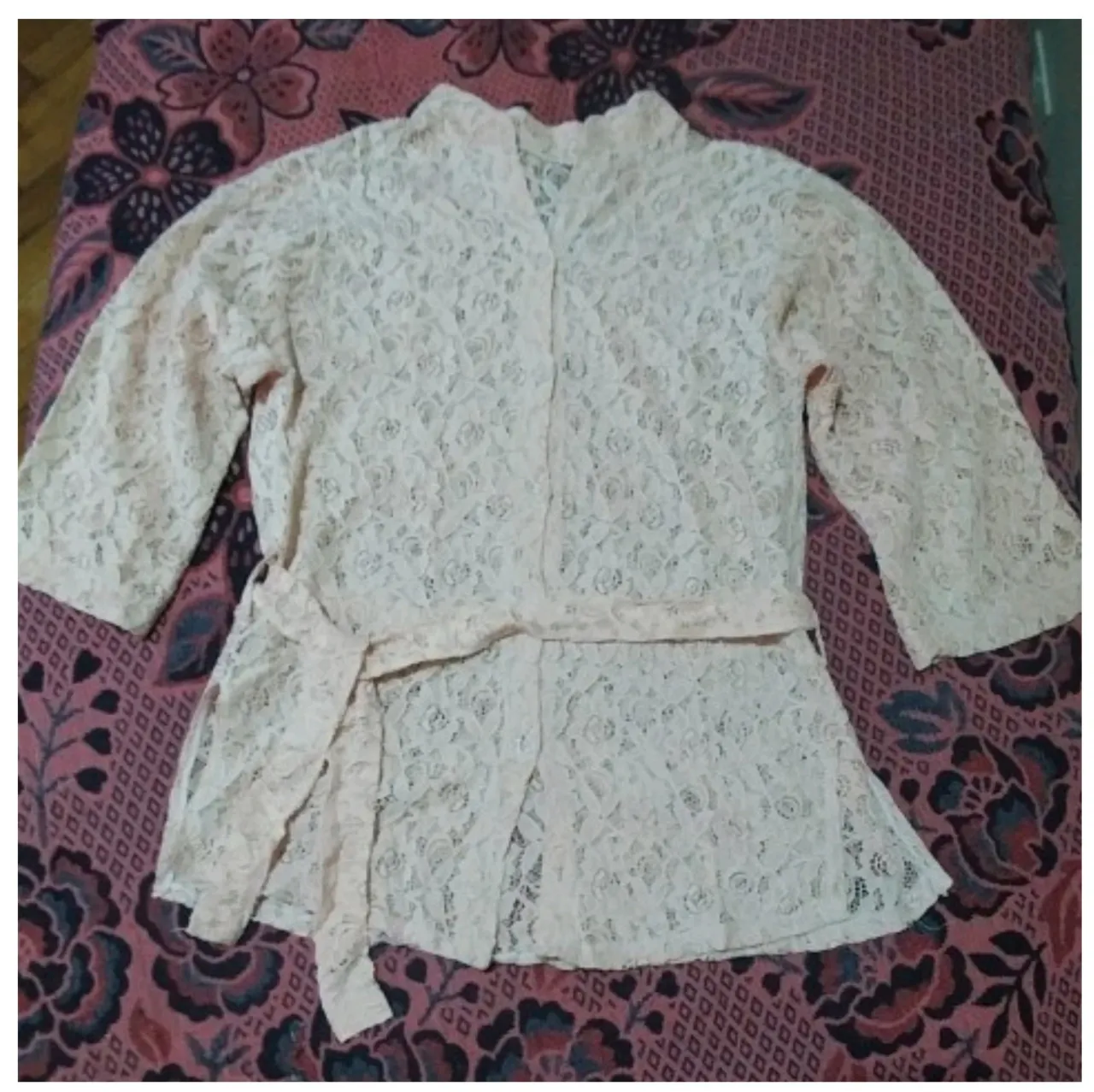 Blusa de encaje color rosa pálido con mangas 3/4, cinturón de tela a tono y botones al frente. Las mangas pueden achicarse. No marca talle, pero será un talle 2. Medidas: pecho 47cm, espalda 40cm, largo total desde el hombro 66cm.
