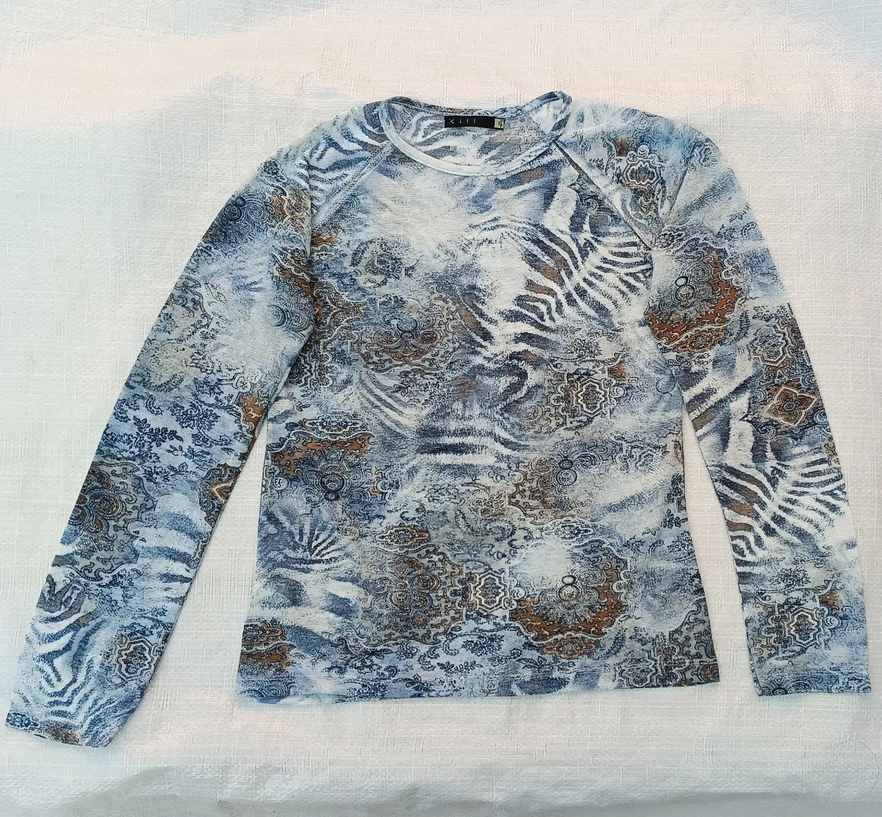 Remera de manga larga con estampa abstracta y animal print en tonos azules, blancos y marrones. Prenda de frente con aberturas a altura de las axilas. 100% poliester MEDIDAS: Contorno de busto (76cm.) Contorno de cintura (76cm.) Largo (50cm.) Largo de mangas (65cm.)