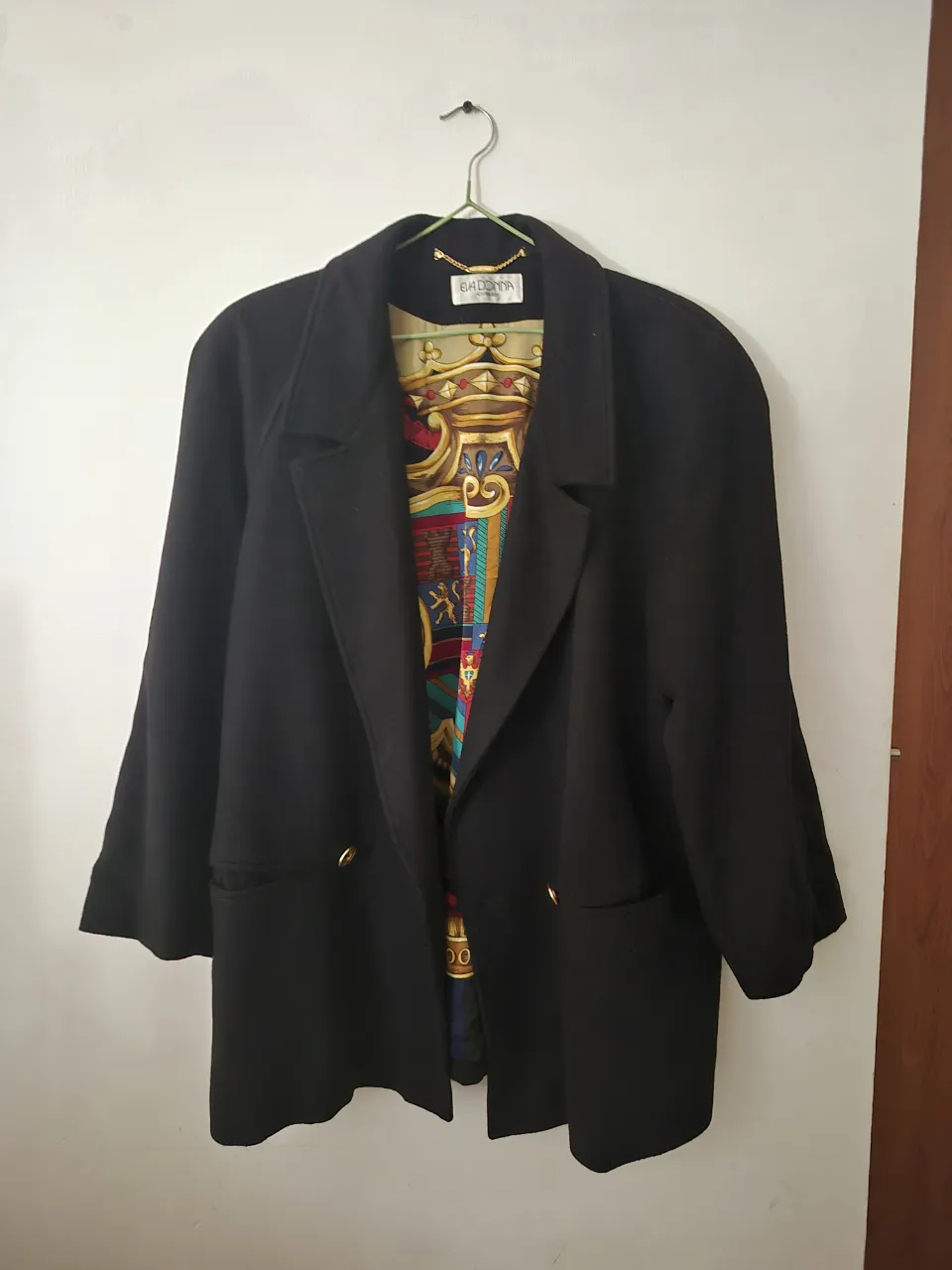 Blazer negro con un forro interior súper llamativo y colorido, estilo VINTAGE,con un diseño de escudos y cintas doradas. Tiene botones dorados en el frente y bolsillos. Ideal para darle un toque de elegancia y originalidad a cualquier outfit. Detalles de confección (manga) y boton