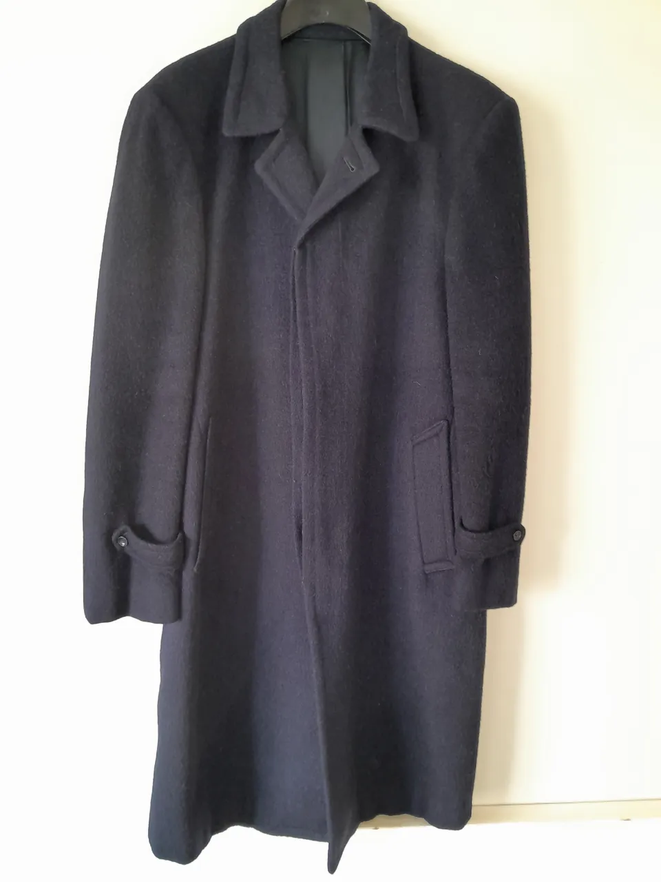 Tapado de paño azul marino, largo hasta la rodilla, con cuello solapa, tres botones al frente y dos bolsillos laterales con tapa. En las mangas tiene un detalle de botón.