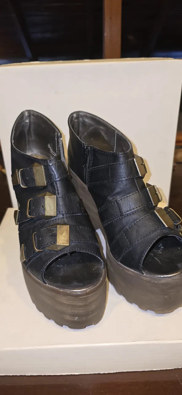 Sandalias negras con plataforma y taco de madera. Tienen tres tiras con hebillas doradas y puntera abierta.