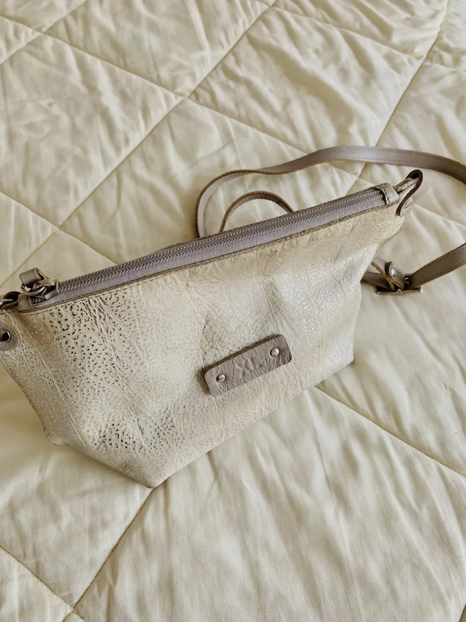 Bolso bandolera como de cuero blanco roto, con textura y detalles metálicos. Ideal para el día a día o salidas casuales. Está usada pero como se ve en fotos pero en re buen estado, es bastante amplia por dentro. tiene su bolsita