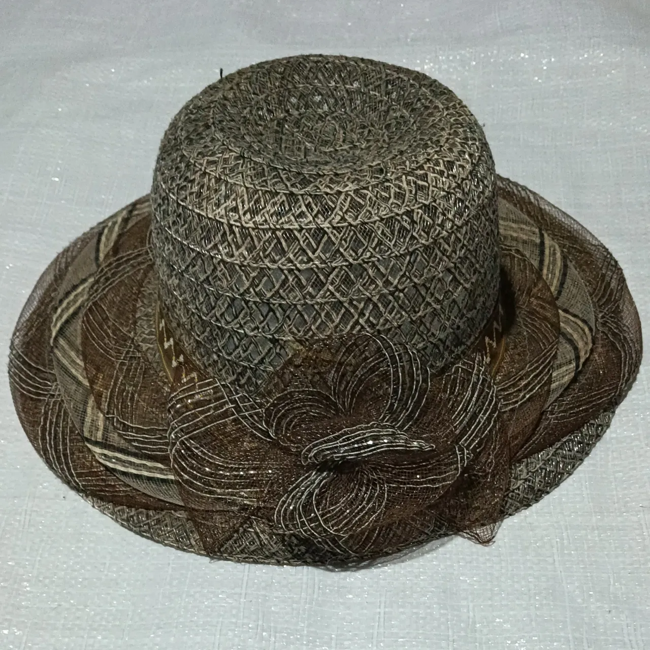 Sombrero de paja tejido con cinta de tela estampada y flor decorativa. El interior tiene una cinta de ajuste. DIÁMETRO DE LA CABEZA: (55cm.)