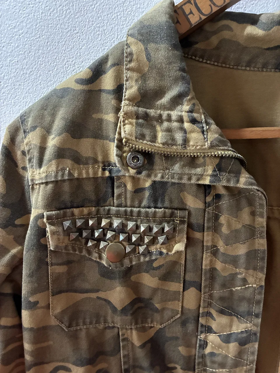 Campera de jean estilo militar con estampa camuflada. Posee tachas plateadas en los bolsillos y cordones ajustables en la cintura. Ideal para un look canchero y urbano.