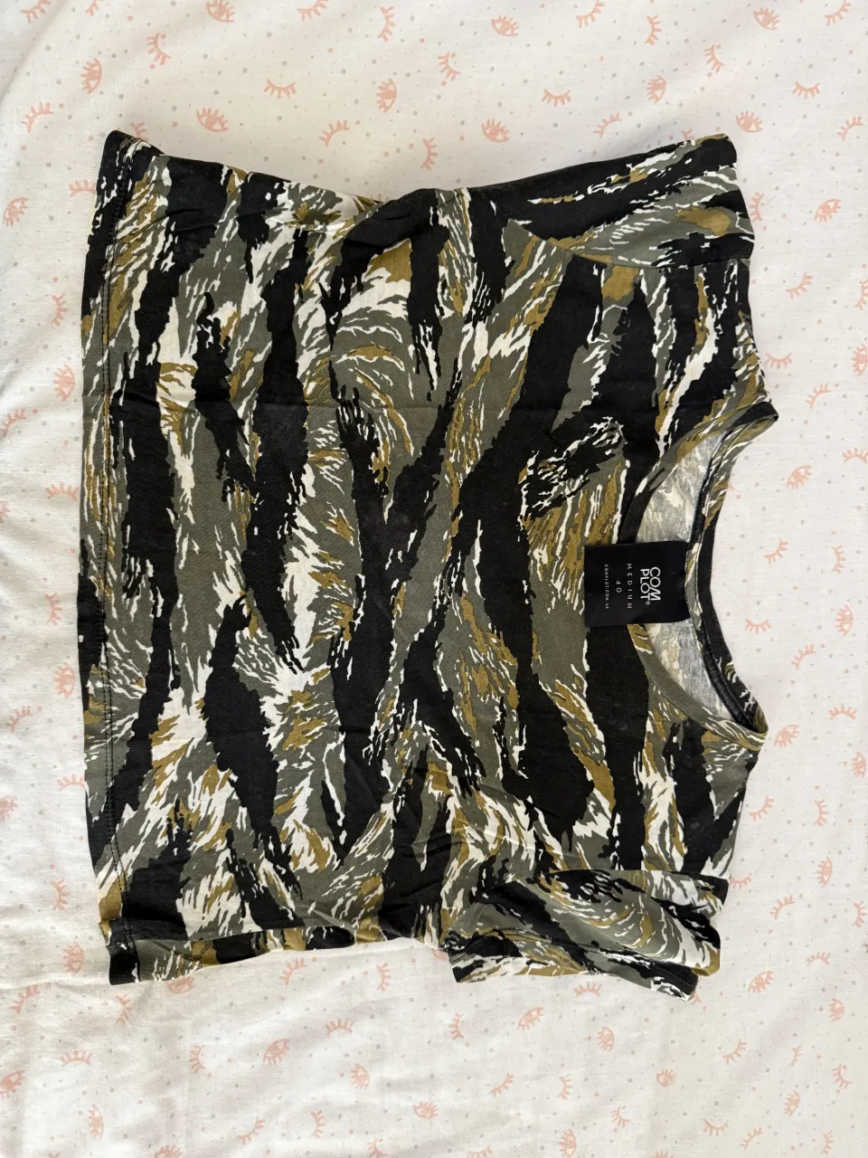 Remera estampada con diseño de camuflaje en tonos verdes, negros, blancos y ocres. Posee cuello redondo y mangas cortas.