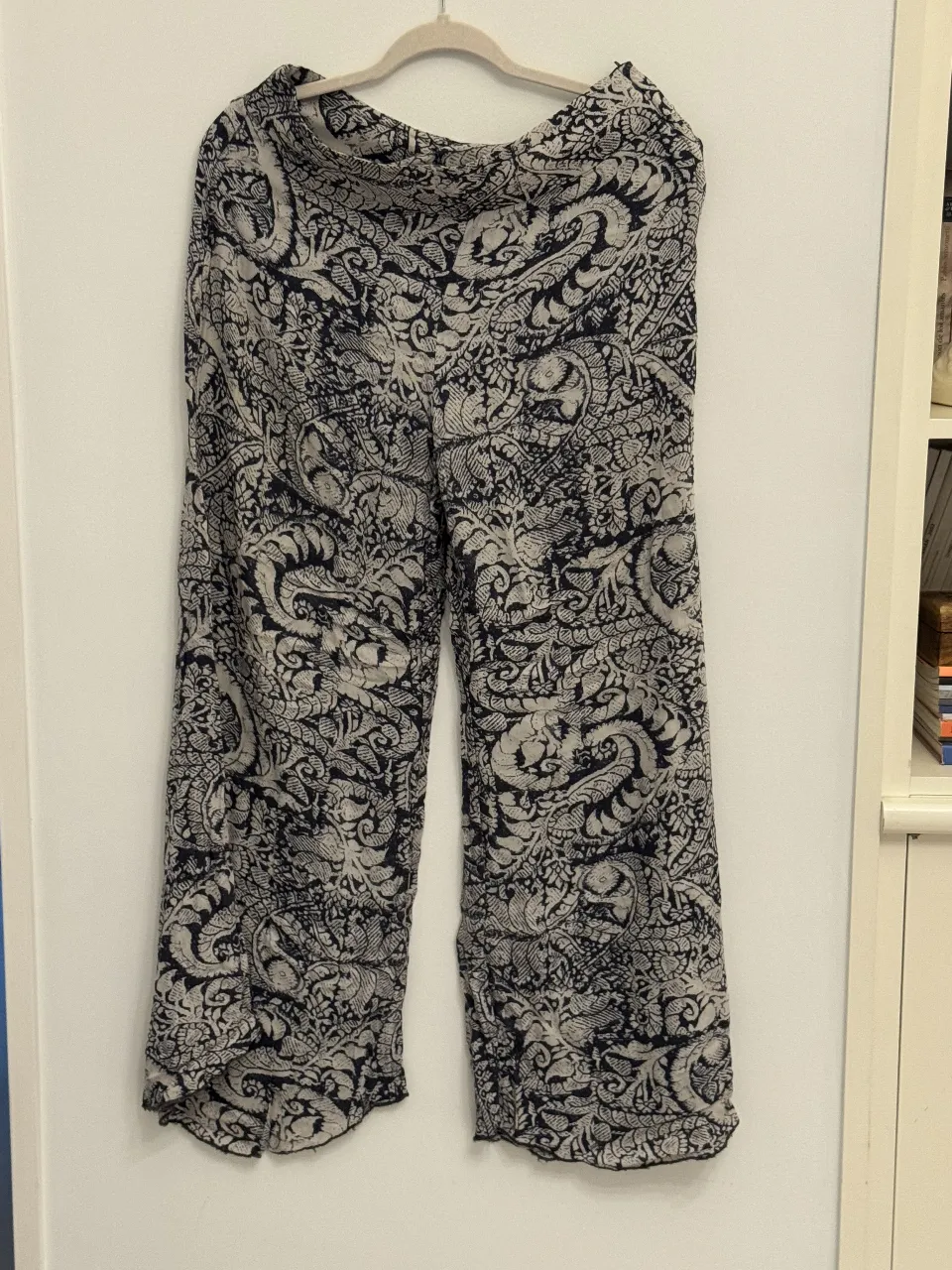 Pantalón palazzo estampado con diseño paisley en tonos azul grisáceo y crudo. Detalle de volado y abertura en el tobillo. De tela liviana y fluida, y muy fresco, ideal para un look boho chic o casual.