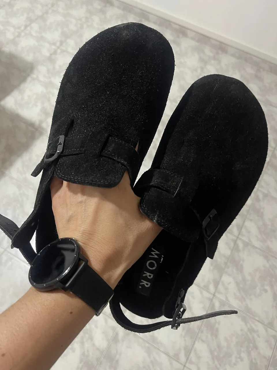 Zuecos negros de gamuza con hebilla ajustable. Perfectos para un look cómodo y canchero.