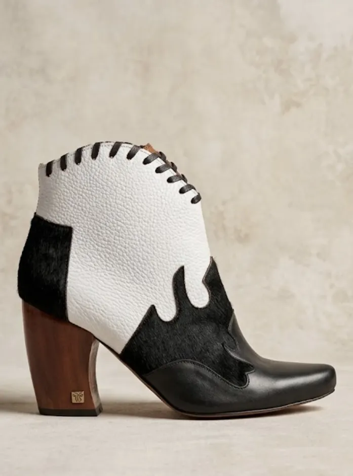 Botas de cuero negras y blancas con detalles de pelo, taco de madera y cordones arriba en cuero