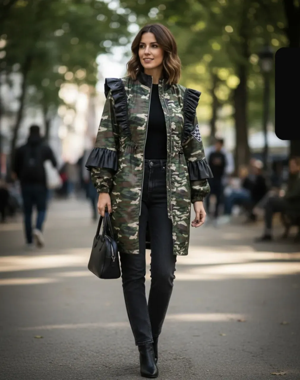 Campera larga estilo militar con estampa de camuflaje. Posee detalles de volados en los hombros y puños, y detalles en cuero sintético. Ideal para un look canchero y moderno. Talle m/L