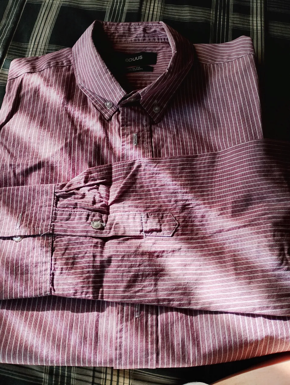 Camisa de vestir de hombre, manga larga, con un delicado estampado de rayas verticales en tonos rojos y blancos. Su corte slim fit la hace moderna y estilizada, ideal para lucir elegante en cualquier ocasión.