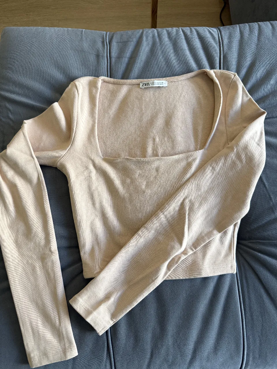 Remera manga larga Zara de escote cuadrado, súper canchera y versátil. Ideal para combinar con jeans o faldas. Su diseño moderno la hace perfecta para cualquier ocasión.