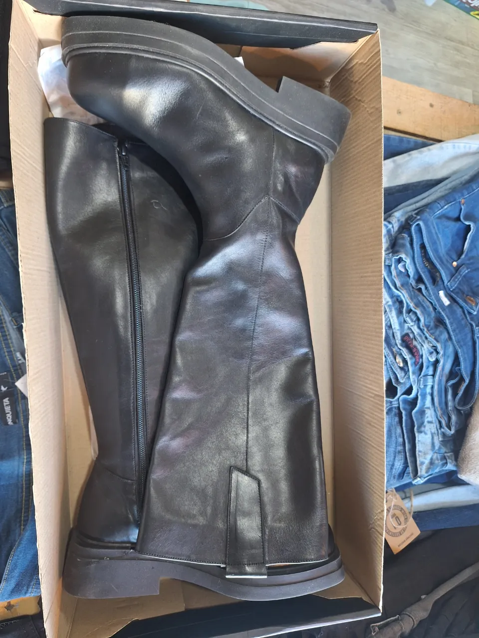 Botas de cuero negras, caña alta, con cierre lateral y suela gruesa con diseño.