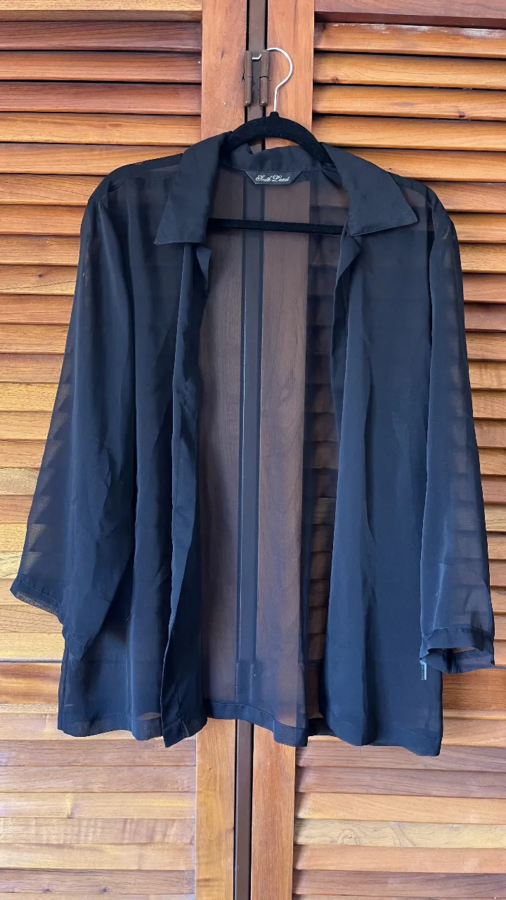 Camisa negra de seda transparente, ideal para usar abierta sobre otra prenda o como salida de playa. Manga larga y corte recto.