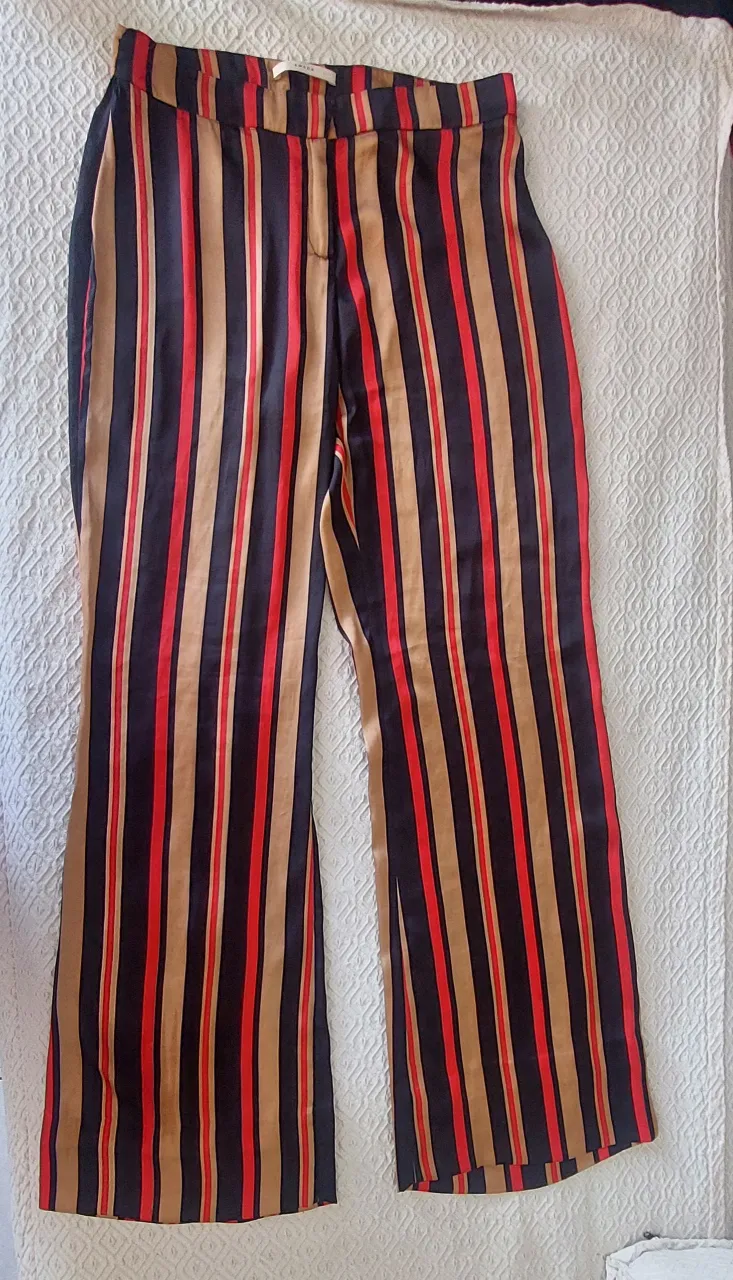 Pantalón palazzo Awada. 100% Poliester con rayas verticales en negro, rojo y beige. Un diseño vibrante y elegante, perfecto para un look sofisticado y moderno. Ideal para eventos o para darle un toque chic a tu día a día.