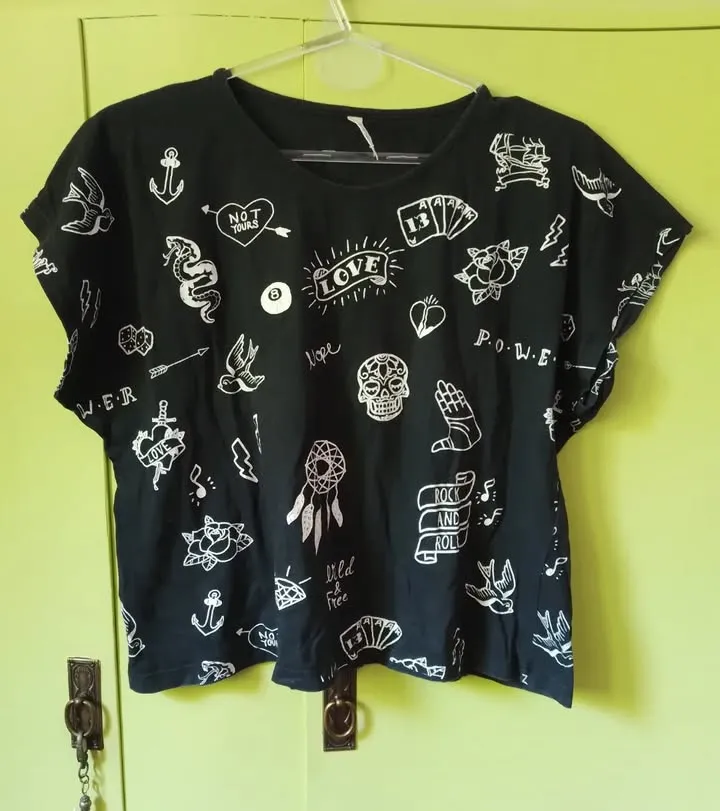 Remera negra con estampas en blanco "tattoo style" de "Sybilla Collection". Diseño con motivos de anclas, golondrinas, serpientes, corazones, calaveras, cartas de póker y frases como "Love", "Power", "Rock and Roll", "Not Yours", "Wild & Free". Ideal para un look urbano y canchero. Talle M. Medidas: axila a axila 60 cm, largo 53 cm. ... Comprando dos o más prendas, agrego otra prenda o accesorio de regalo!