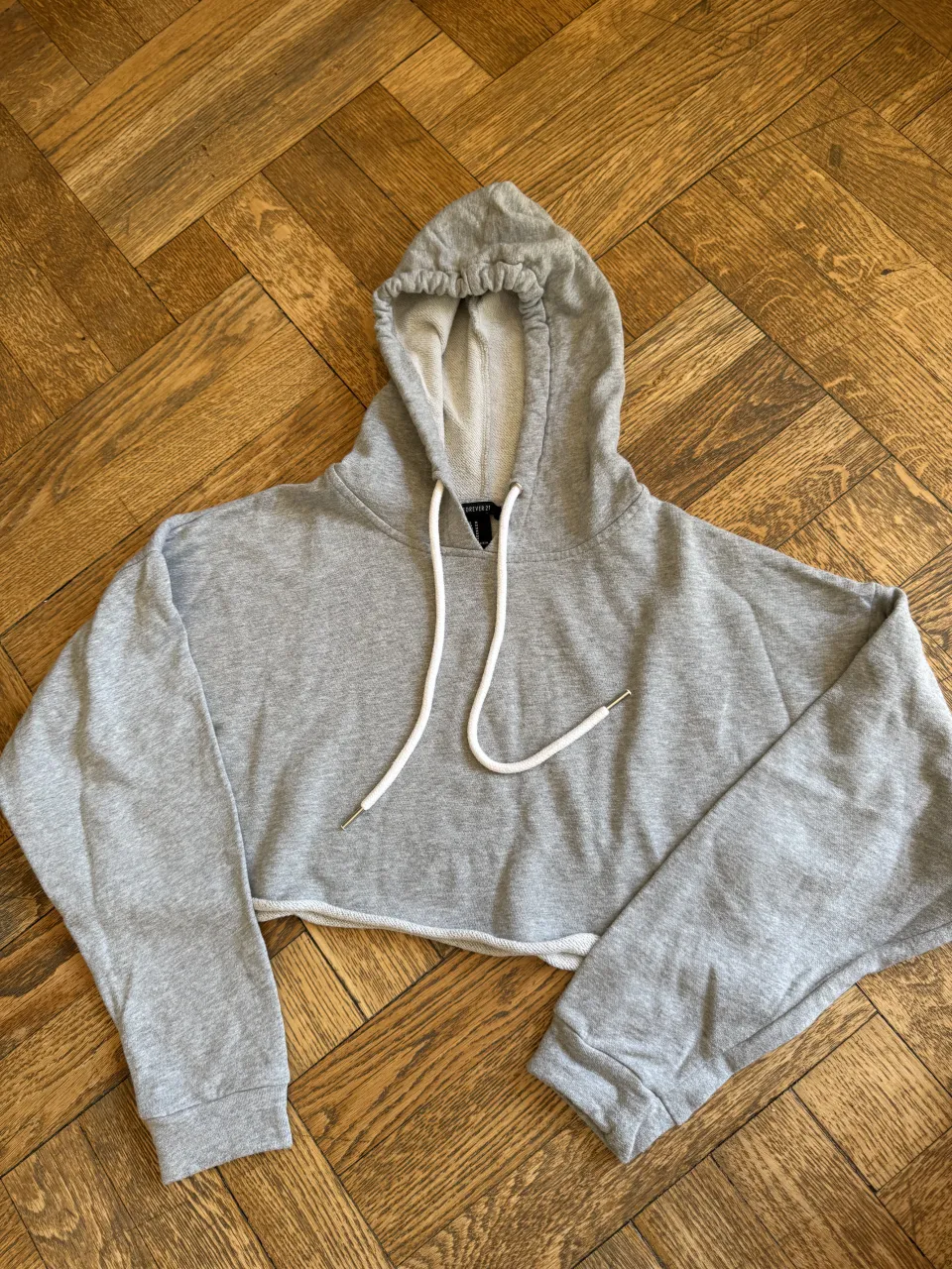 Buzo Forever 21 crop gris con cordones blancos y capucha.