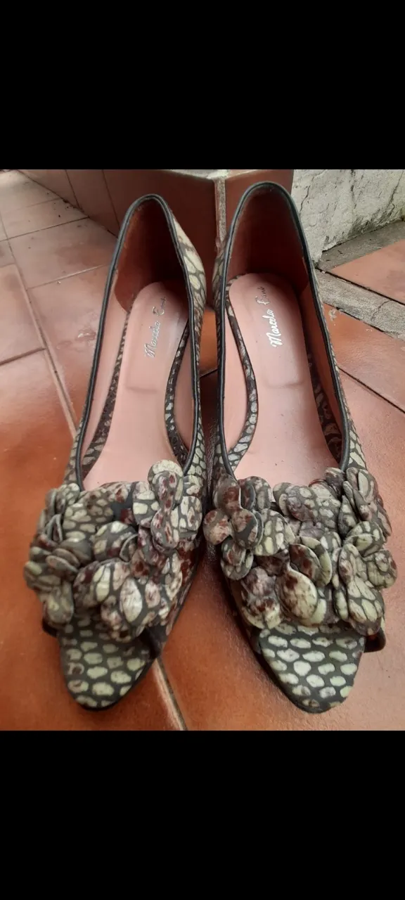 Zapatos de mujer con taco cuña, diseño serpiente y apliques de flores en la punta. Ideales para un look elegante y sofisticado.