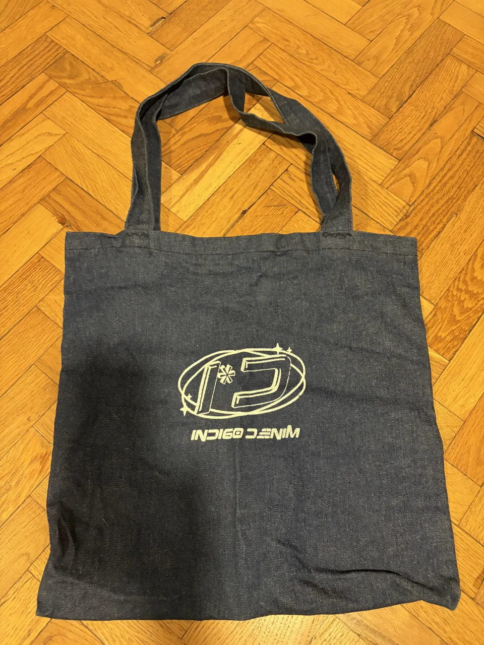 Bolso de tela de jean azul con estampa blanca "INDIGO DENIM" y un logo ovalado con estrellas.