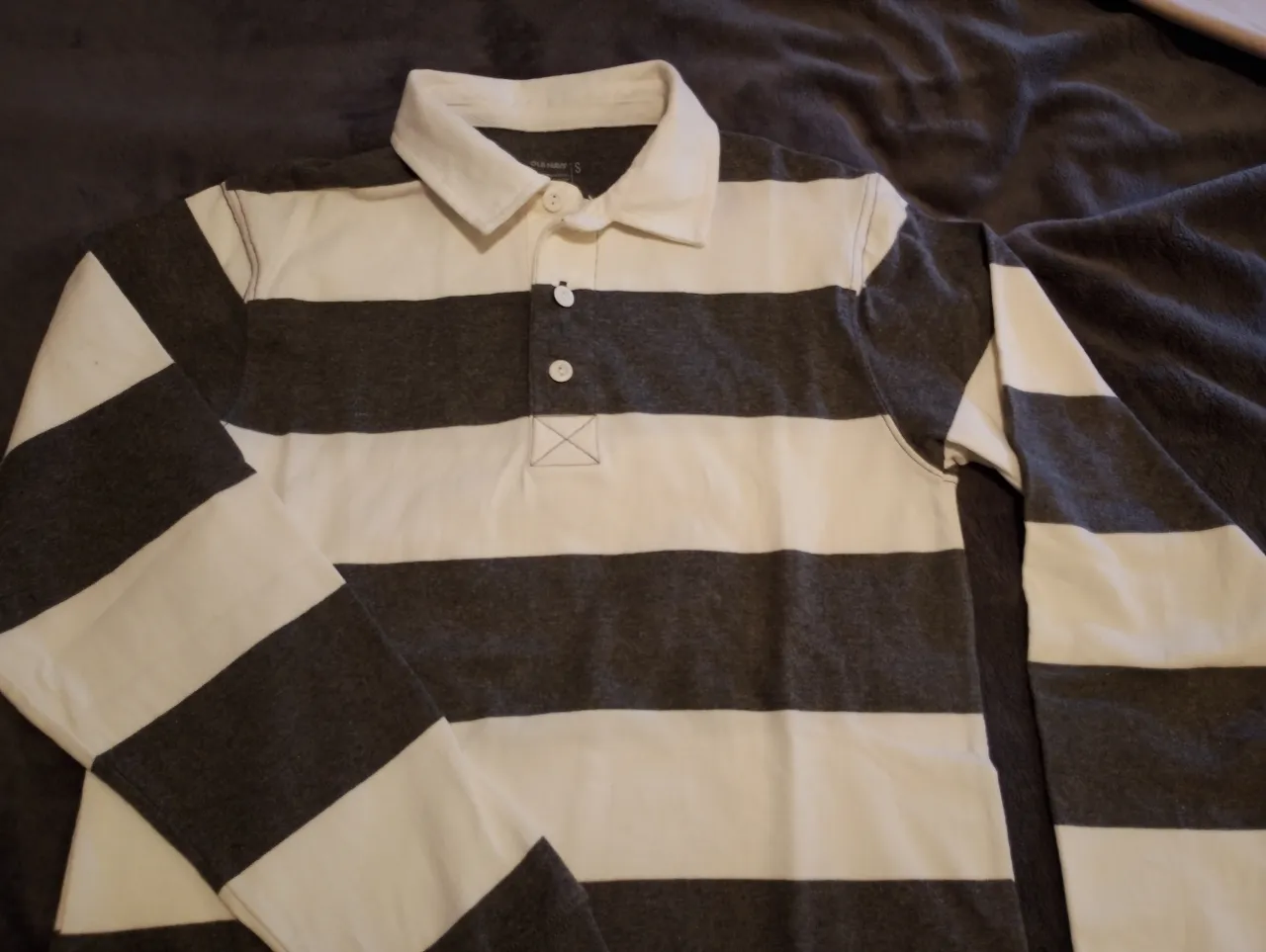 Remera de manga larga a rayas grises y blancas. Tiene cuello tipo polo con botones.