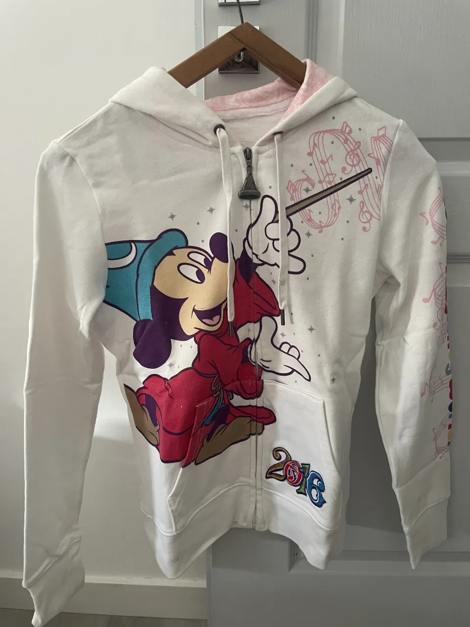 Buzo blanco con cierre y capucha, estampado de Mickey Mouse vestido de mago en el frente. En la espalda, estampado de varios personajes de Disney y "Walt Disney World 2016 Music, Magic, Memories".