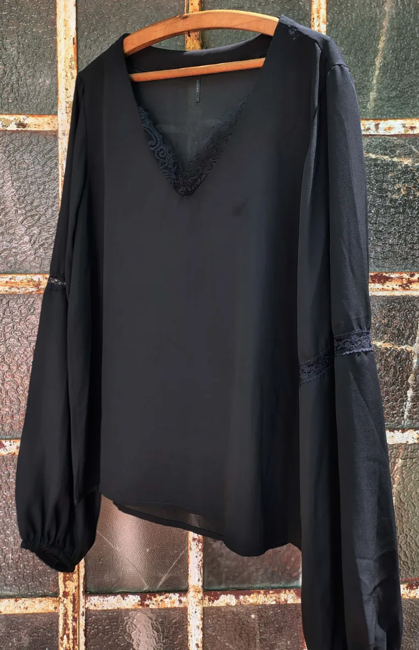Blusa negra de manga larga con detalles de encaje en el escote en V y en las mangas. Las mangas son amplias y terminan con elástico.