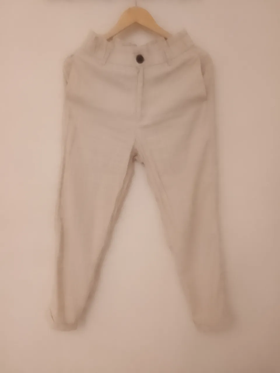 Pantalón color crudo con elástico en la cintura y un botón en la parte delantera.