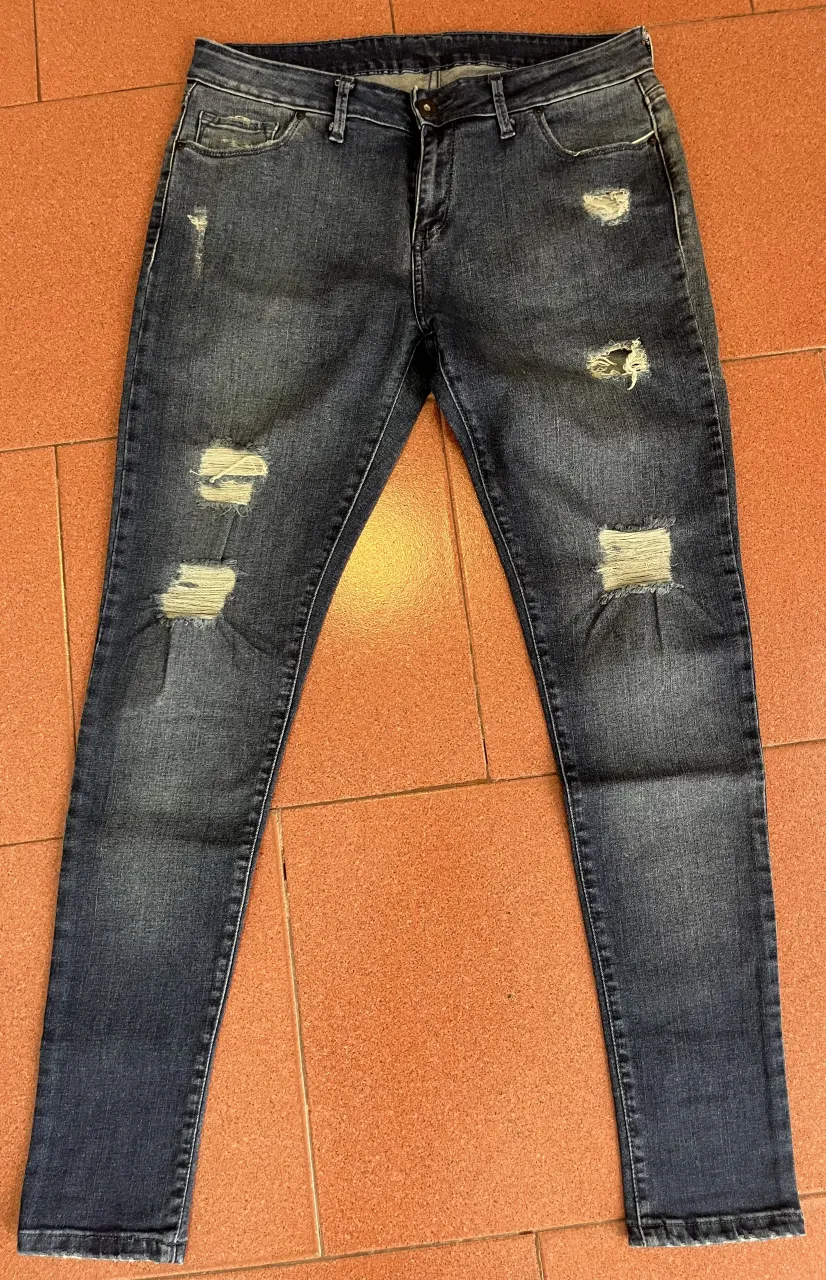Jeans de corte ajustado con roturas y desgastes. Presentan detalles de tela deshilachada en rodillas y bolsillos traseros.