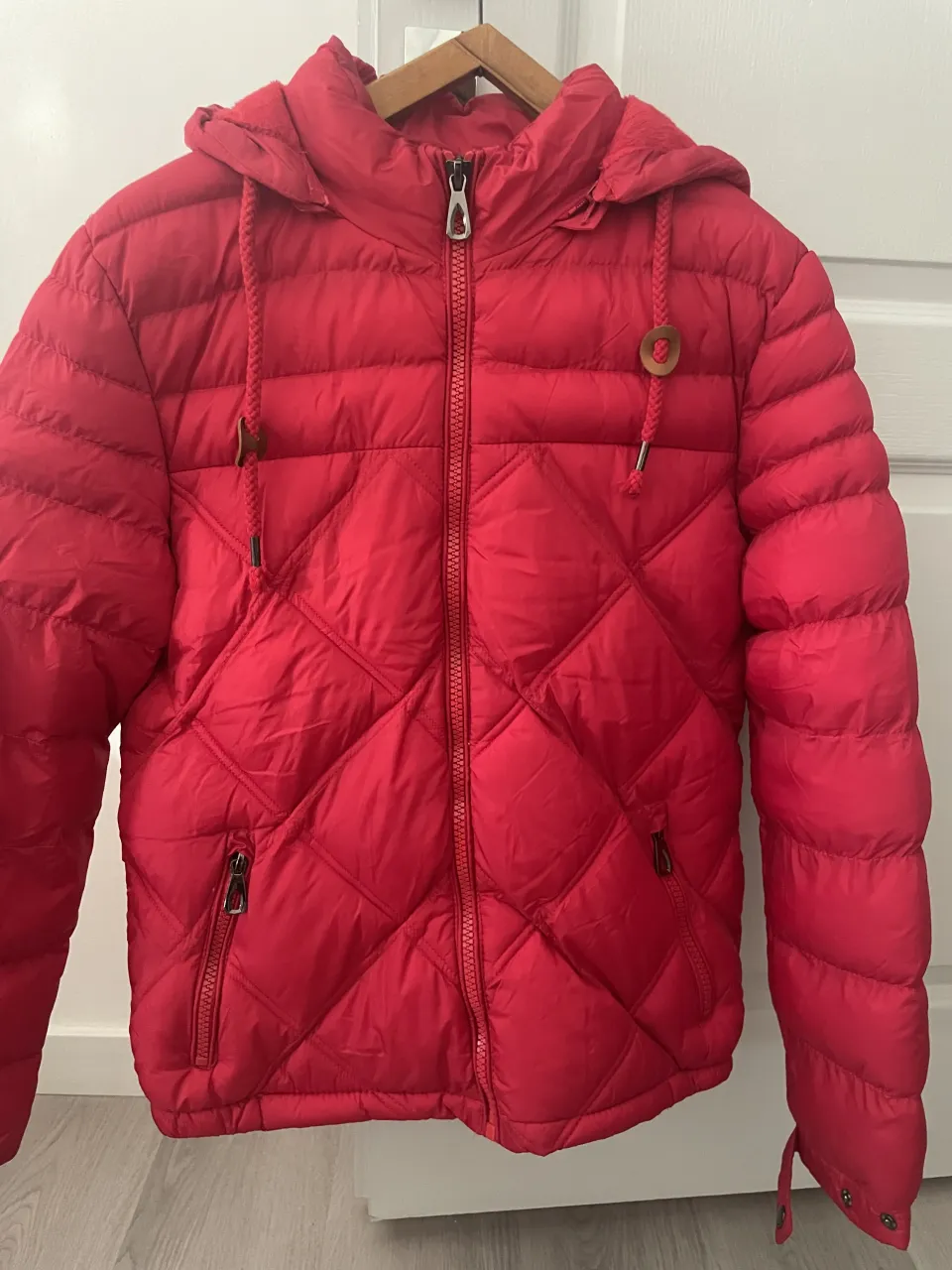 Campera acolchada roja con capucha. Tiene cierre al frente y bolsillos con cierre a los costados. Los cordones de la capucha y los puños son ajustables.