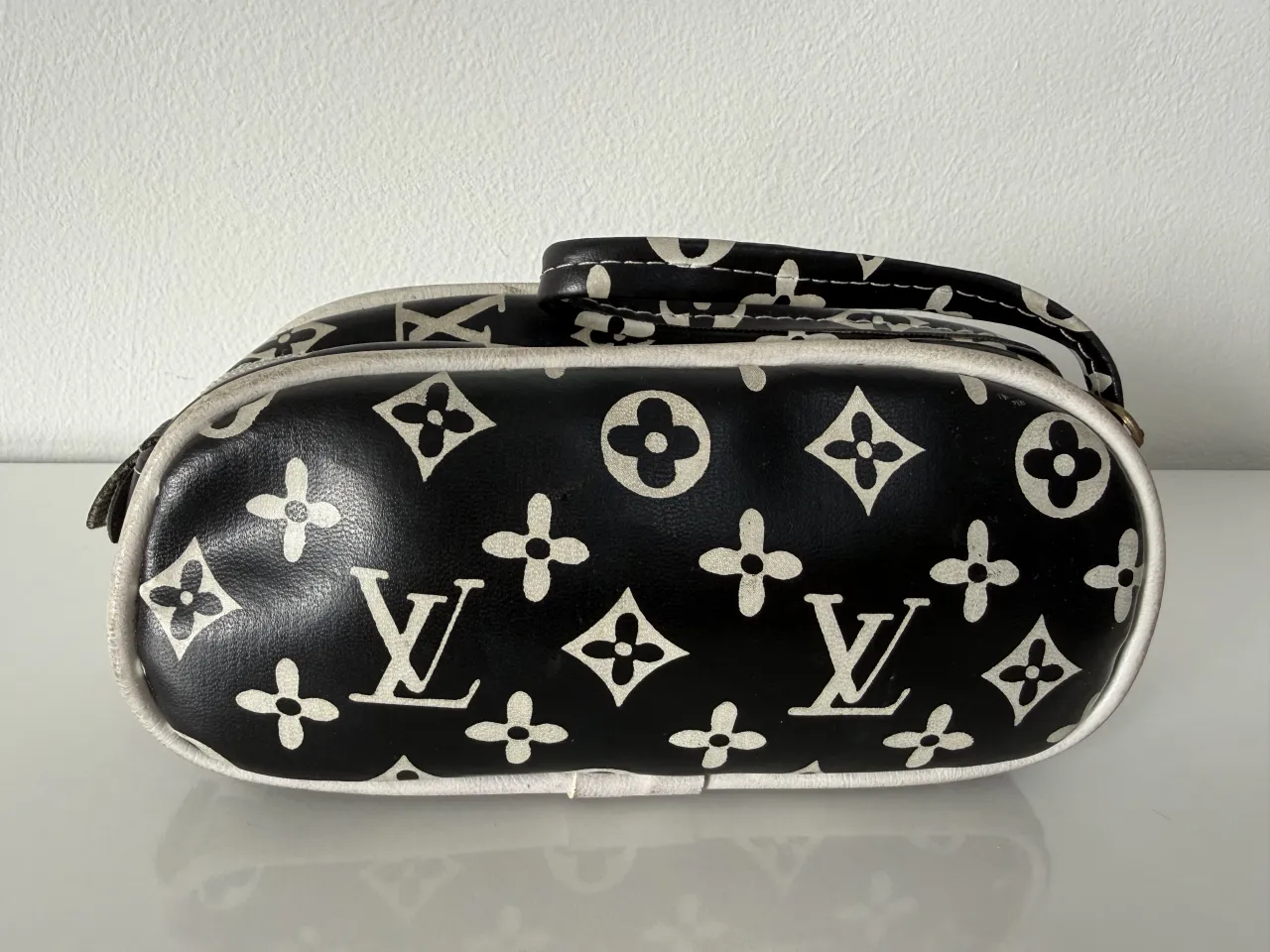 Bolso negro con estampa blanca de monogramas y flores. Tiene cierre y manija. Medidas (son aproximadas): -ancho: 19,5cm -alto: 9cm -prof: 5cm