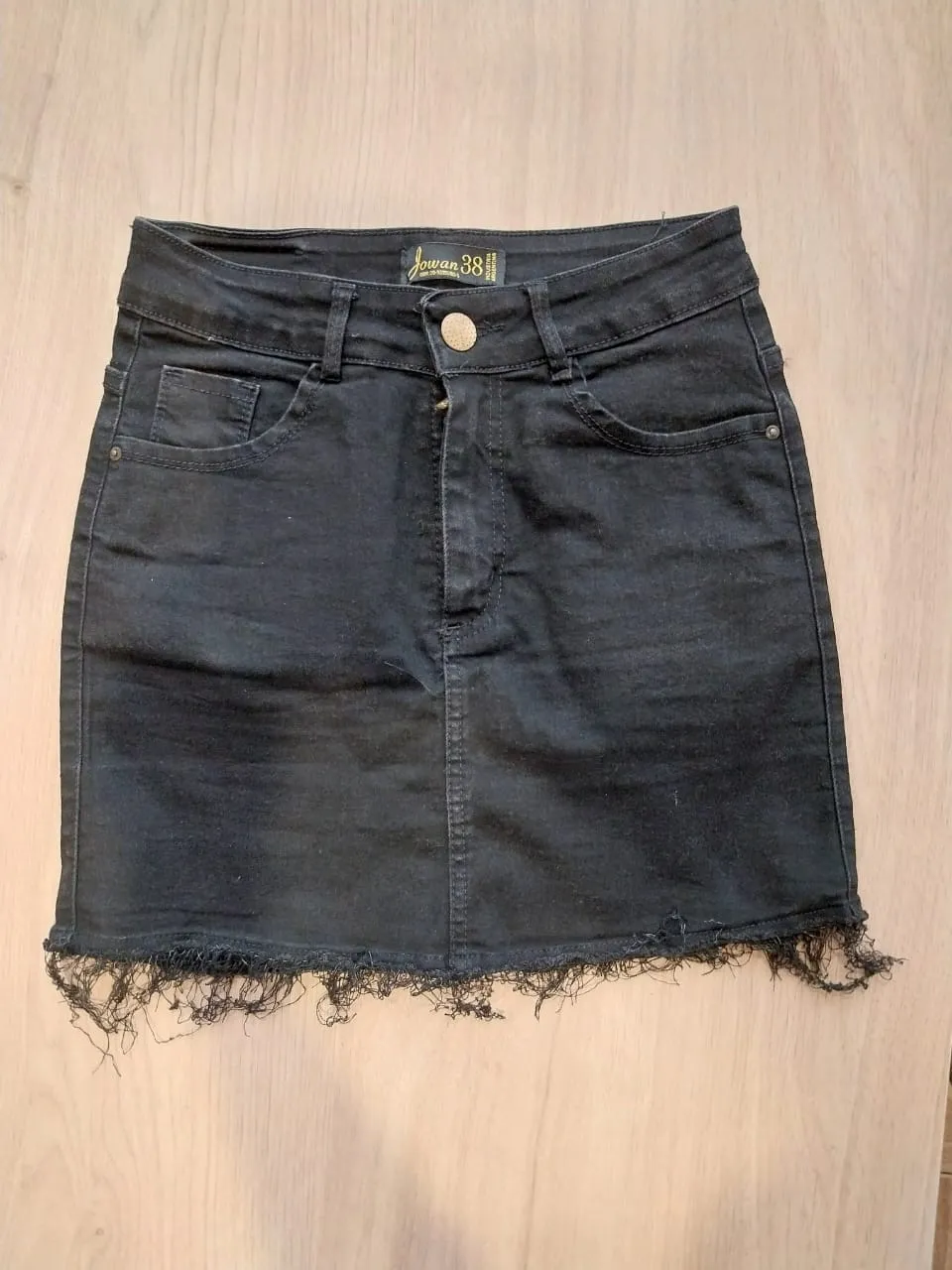 Pollera de jean negra, tiro alto, con roturas y flecos en el ruedo. Un clásico que no puede faltar en tu guardarropa.