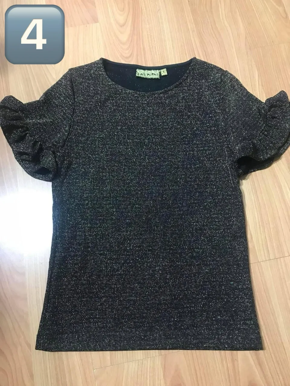 Remera manga corta con brillos plateados y dorados. Posee volados en las mangas.