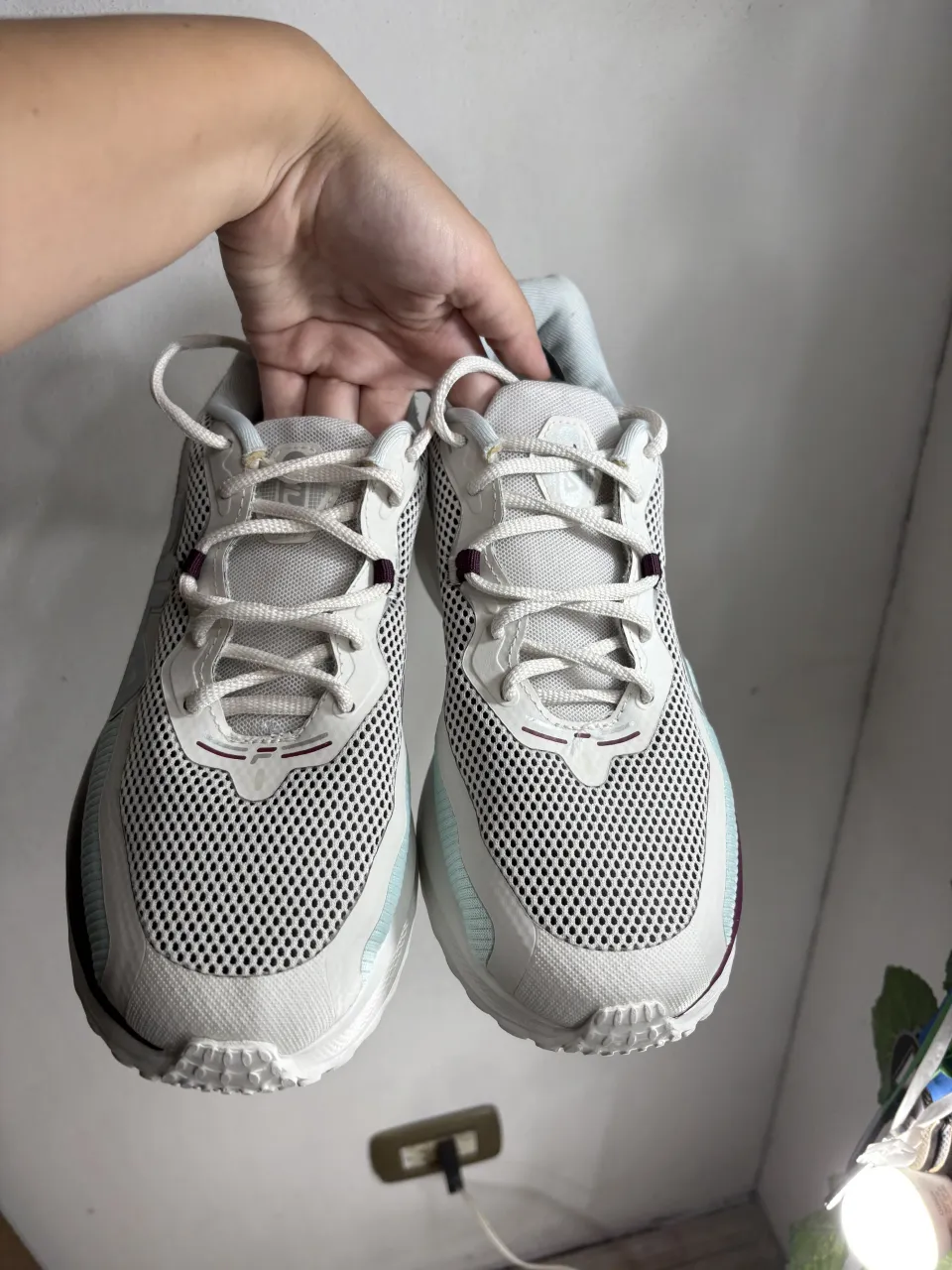Zapatillas deportivas blancas con detalles en color bordó y celeste. Poseen cordones blancos y el logo de la marca en los laterales.