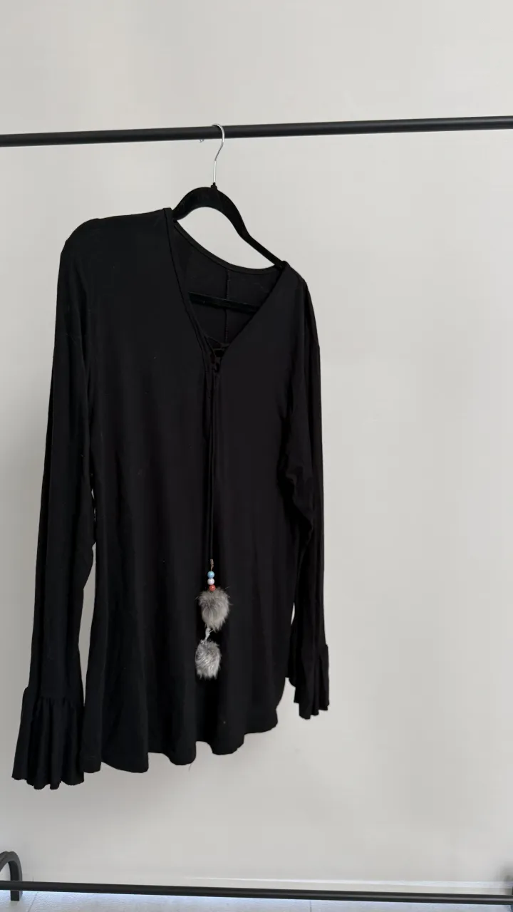 Remera negra de manga larga con detalles de pompones y mostacillas en el escote. Los puños tienen un diseño acampanado con volados. Ideal para un look casual y canchero. talle unico, ver medidas en fotos