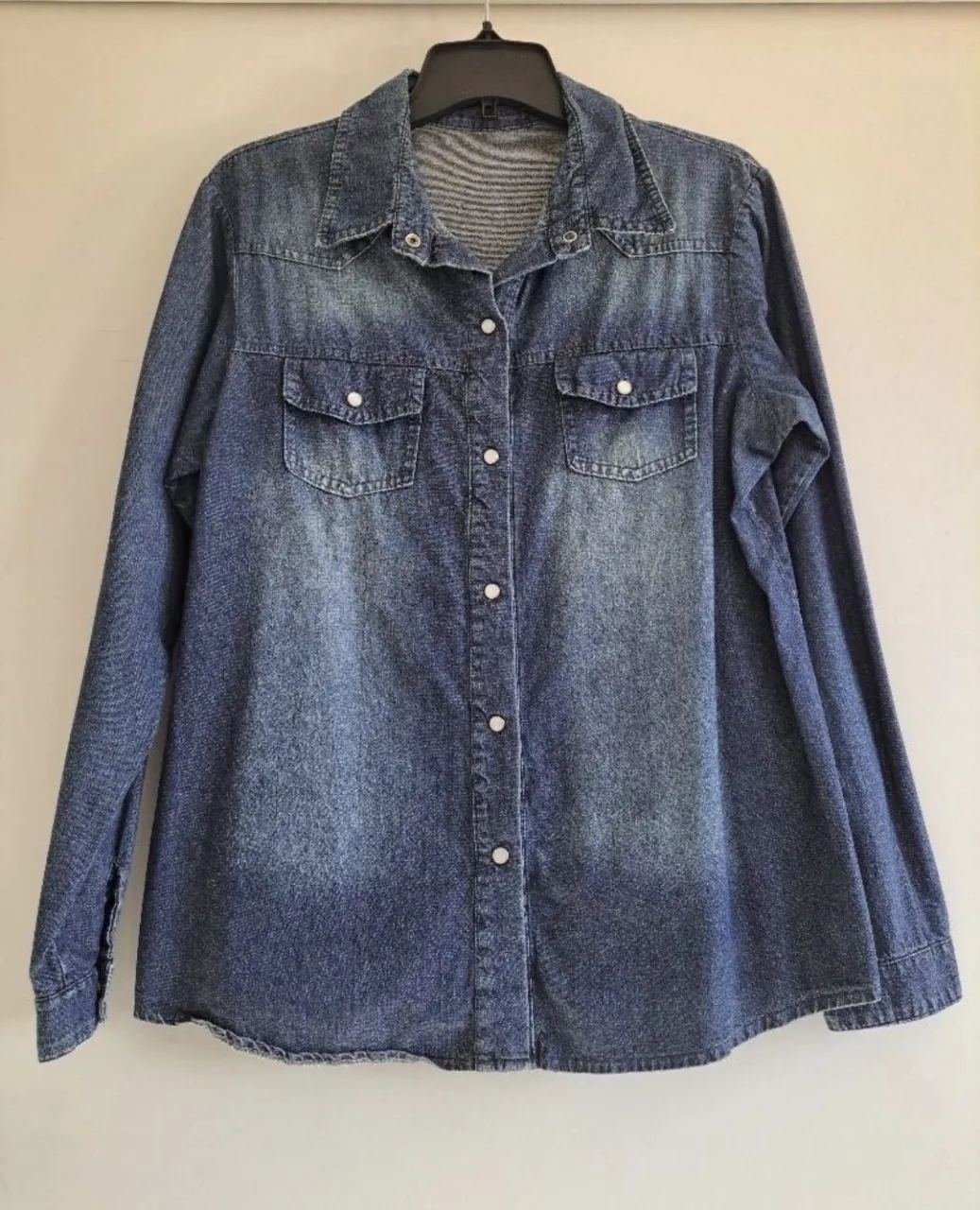 Camisa de jean clásica con dos bolsillos en el frente y botones blancos. Lavado desgastado.