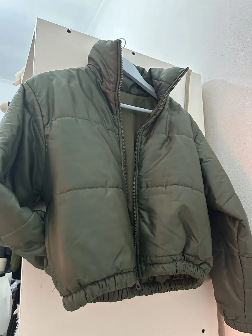 Campera acolchada verde con cuello alto y cierre completo. Posee puños y cintura elastizados.