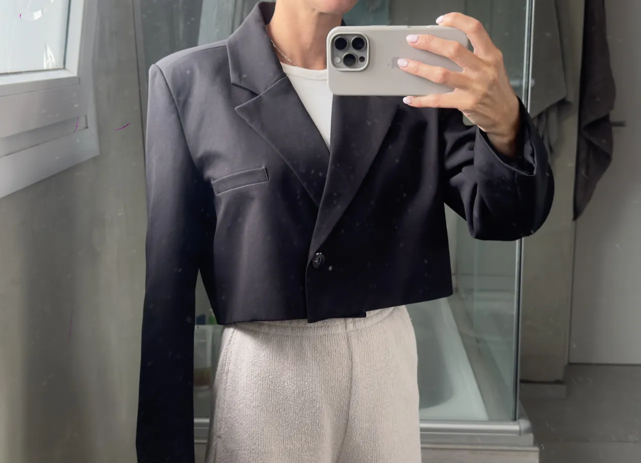 Blazer negro corto, con solapa ancha y un solo botón. Ideal para un look canchero y moderno, perfecto para combinar con pantalones tiro alto o faldas.
