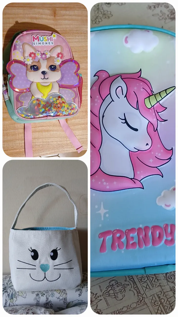 Mochila infantil "Mushi Simones" con diseño de perrito y alas de mariposa. Ideal para jardín o paseos. Super tierna y original! Más lonchera térmica Trendy de unicornio. Más canasto de pascuas. Todo en perfectas condiciones. Va con 2 pastas dentales Tom's sabor strawberry de regalo.