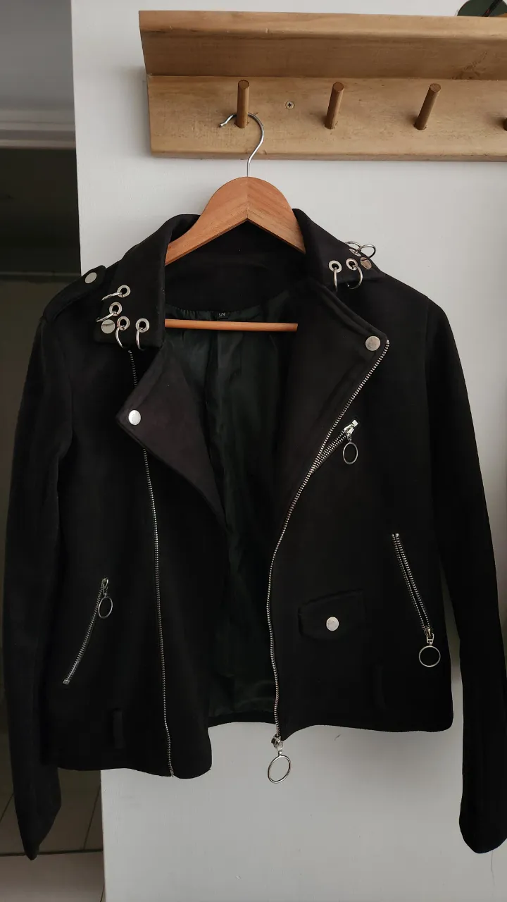 Campera negra estilo biker con tachas plateadas en el cuello y solapas. Posee cierre metálico central, dos bolsillos frontales con cierre y un bolsillo con botón a presión. Tiene detalles de argollas metálicas en los cierres y en el cuello. Gamuza