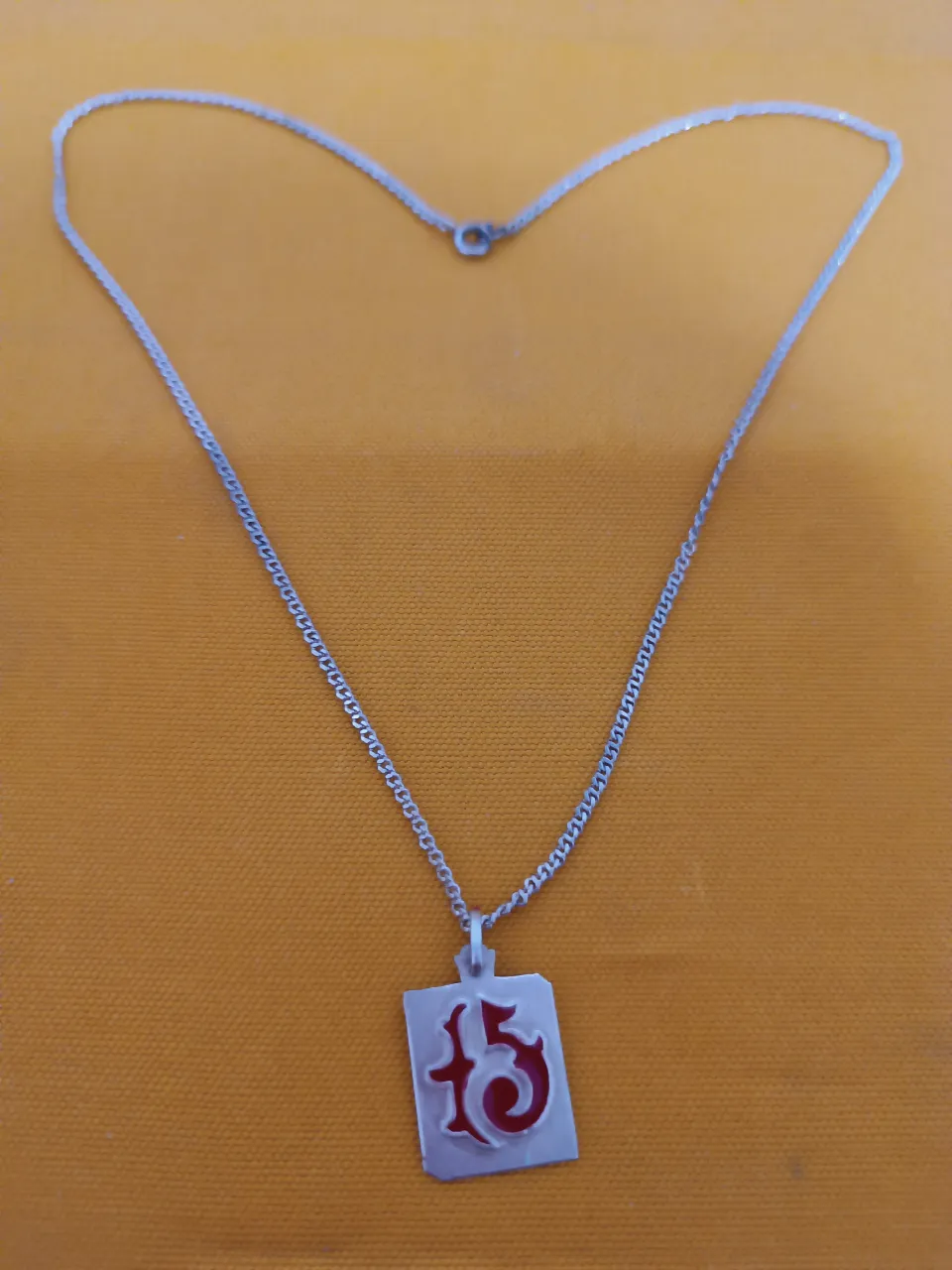Collar plateado con dije cuadrado y diseño de número 15 en color rojo.