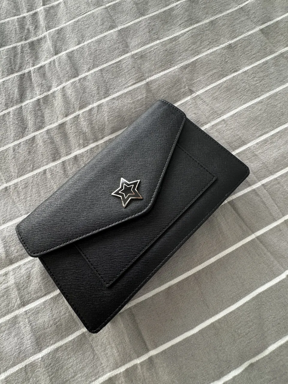 Cartera negra de cuero sintético con detalle de estrella plateada en la solapa. Posee correa de cadena metálica. Ideal para salidas o fiestas.