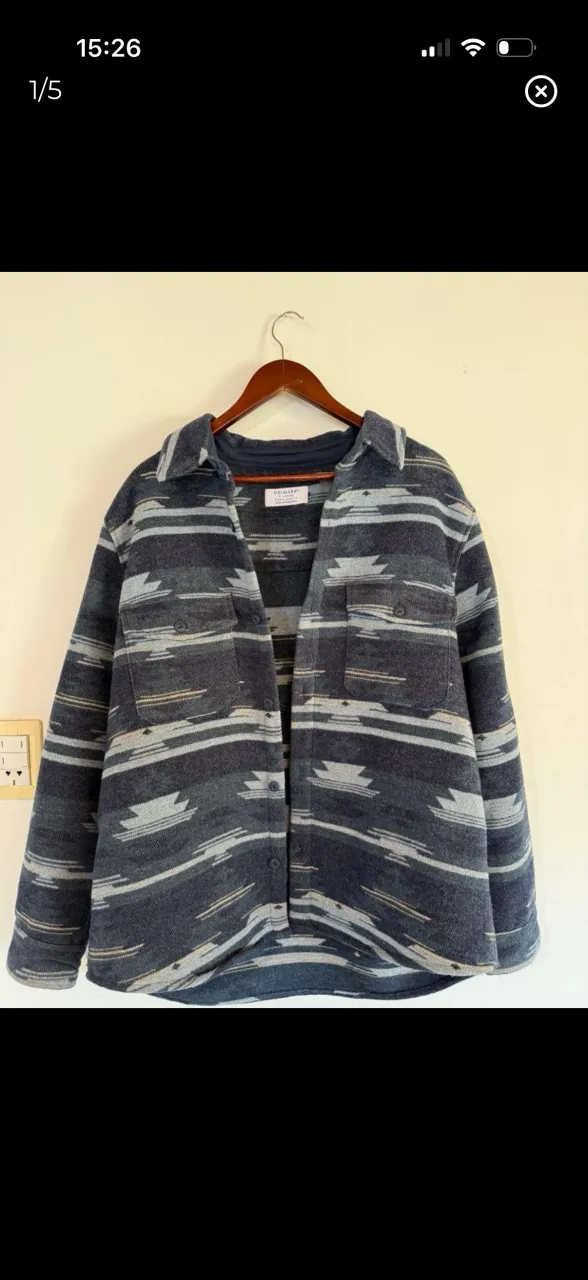Camisa de manga larga con estampa geométrica en tonos azules y grises. Posee cuello camisero, botones al frente y dos bolsillos en el pecho.