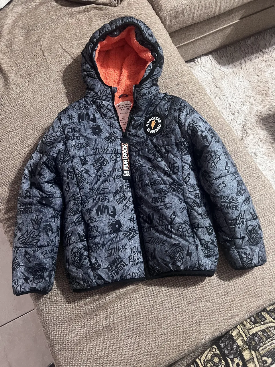 Campera gris con capucha y forro naranja. Estampada con grafismos y frases en negro. Cierre frontal y detalle de parche con rayo y texto.