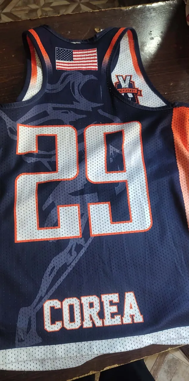 Musculosa deportiva azul con número 29 y nombre "COREA" estampado en blanco y naranja. Posee un logo de "DEW LAX ELITE" y una bandera de Estados Unidos en la parte superior.