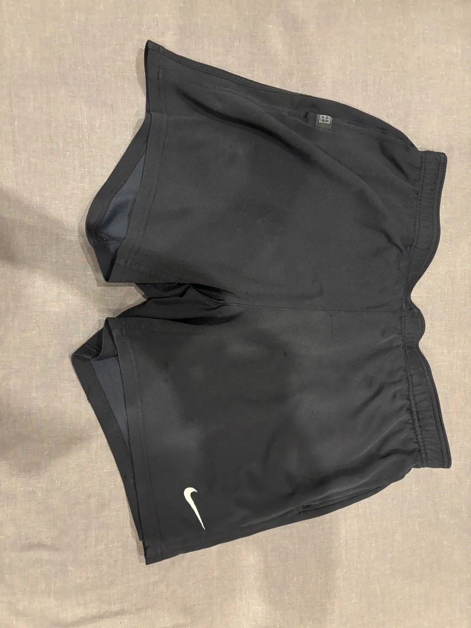 Shorts deportivos negros con logo blanco de Nike en la parte inferior izquierda. cintura ancha (un poco gastado el elástico)