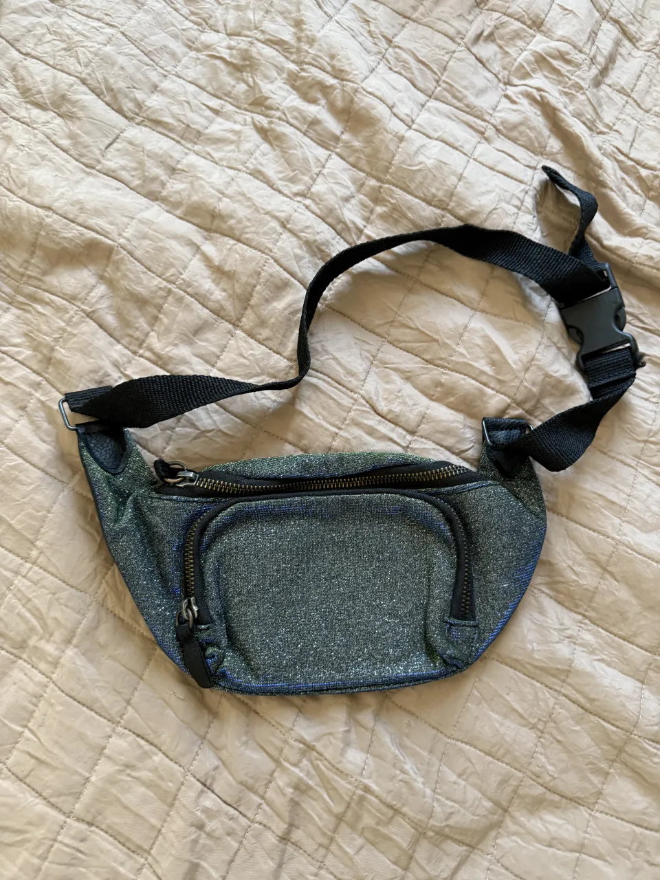 Riñonera negra con detalles plateados y cierre. Ideal para llevar tus esenciales con estilo.