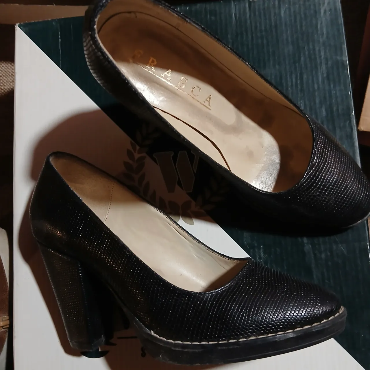 Zapatos de taco alto negros, con textura de reptil. Ideales para un look elegante y sofisticado.