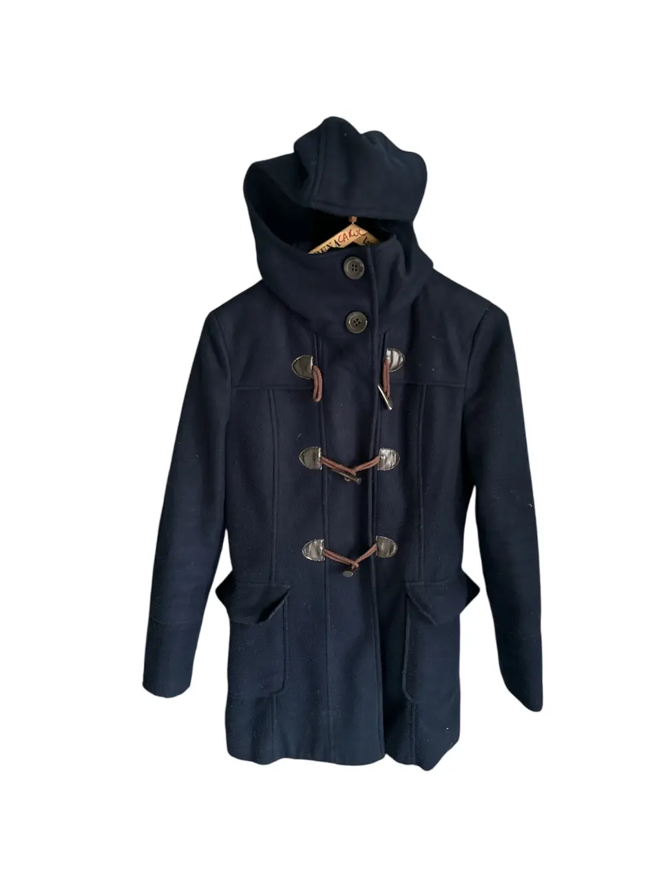 Tapado tipo Montgomery azul marino de la marca Forever 21. Posee capucha, botones y detalles de eco cuero. Ideal para el invierno.